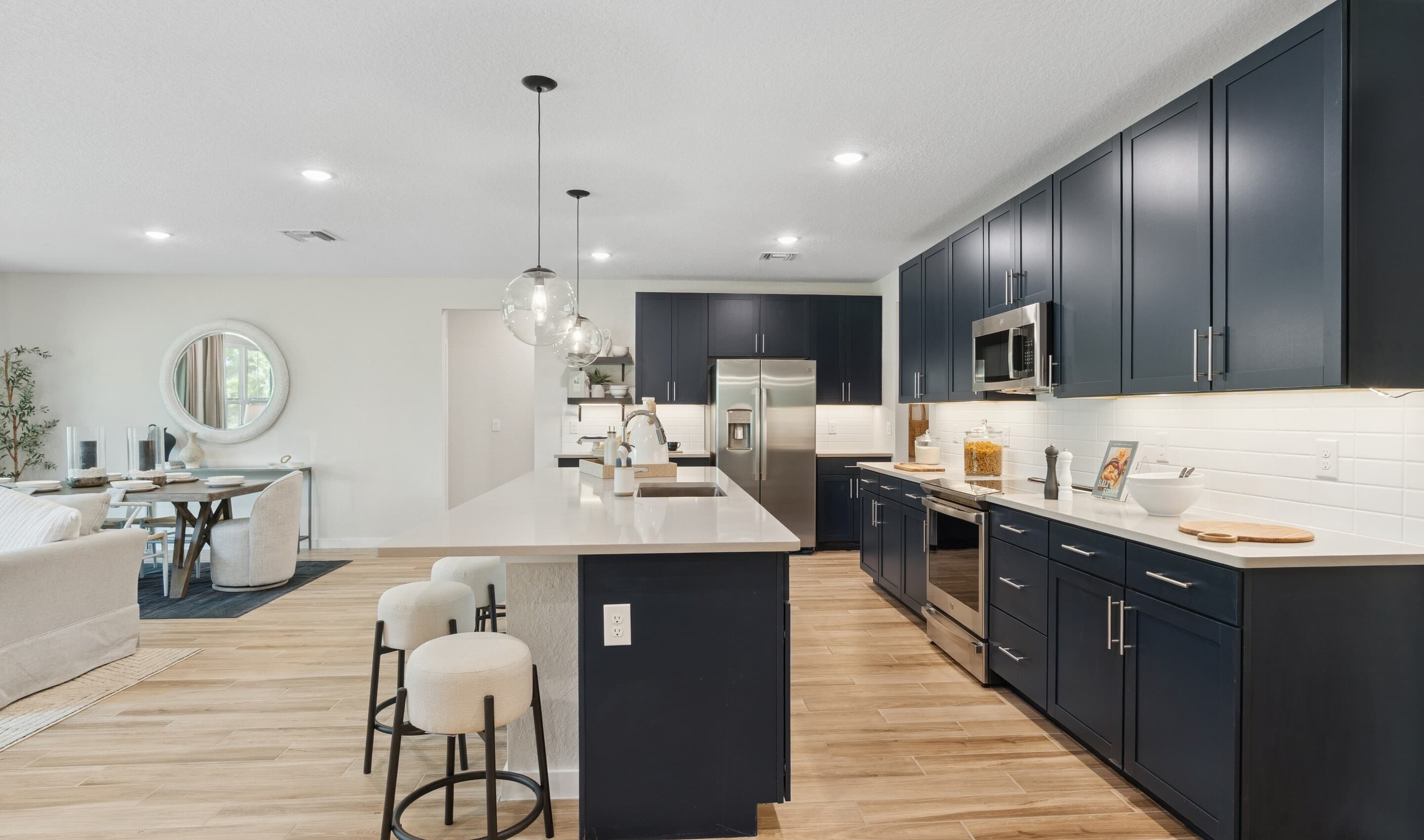 Kitchen with blue cabinets and quartz countertops